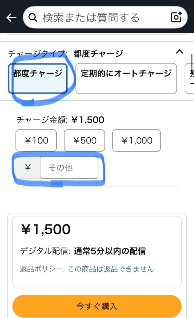 5.「都度チャージ」を選び、「その他」に残高分の金額を入力し、「今すぐ購入」をクリック
