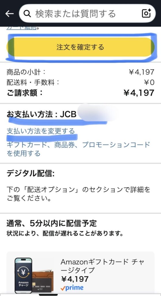 8.支払い方法がバニラカードになっていることを確認し、「注文を確定する」をクリック