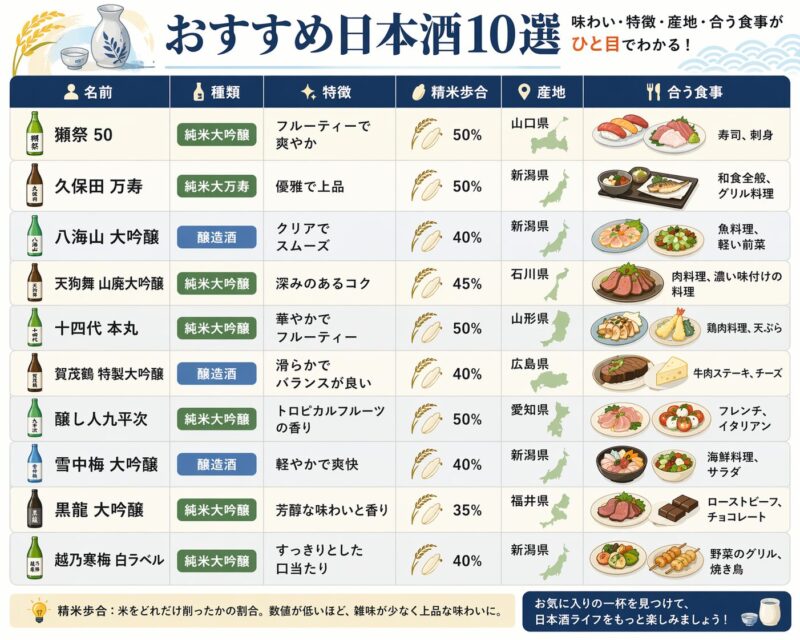日本酒の世界は奥深く、特に大吟醸はその繊細な味わいで初心者からプロまでを魅了します。今回は、日本酒初心者にもぴったりな大吟醸10本を紹介します。特徴や精米歩合、産地、そしてどんな食事と合うかを表にまとめ、その後に詳しくご紹介します。さあ、飲むのが楽しみになること間違いなし!