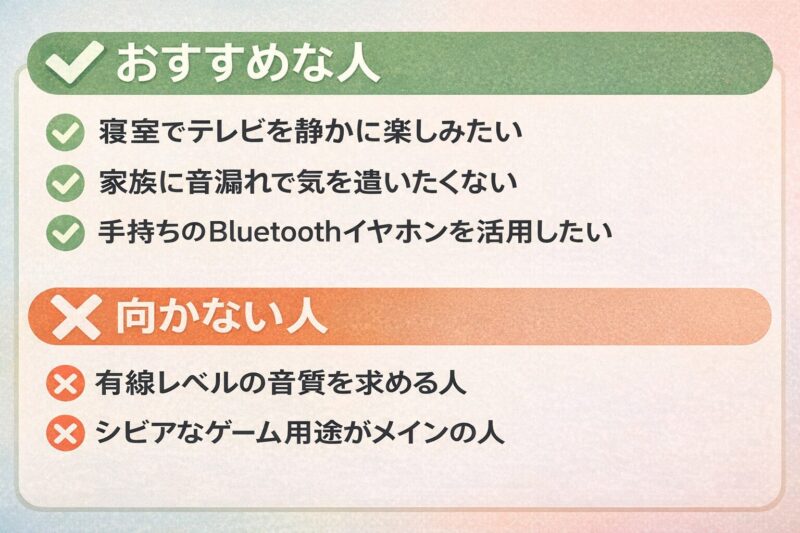 結論から言うと、テレビ×Bluetoothイヤホン環境を作りたい人にJPRiDE JPT1はアリです。