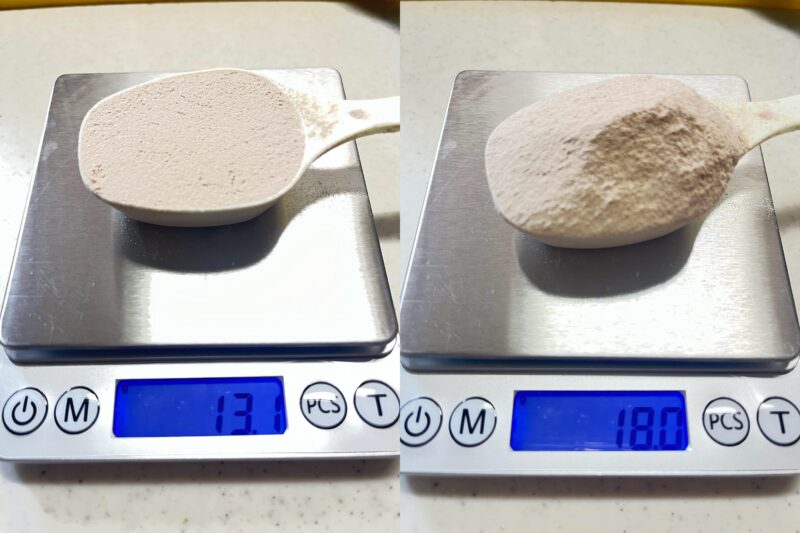 すり切り:1杯13.1g。2杯で26.2g。若干少なめ。