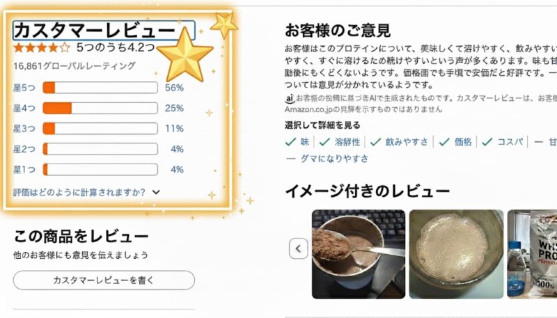 Amazonで見たところ、WINZONEホエイプロテインがレビュー数・評価ともに圧倒的に高く、